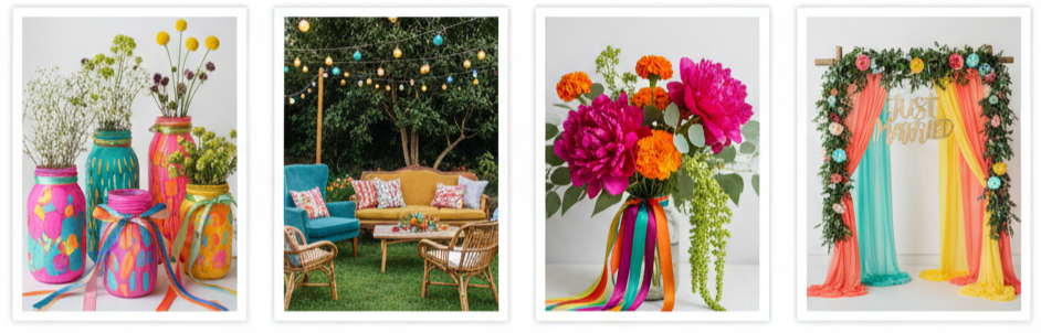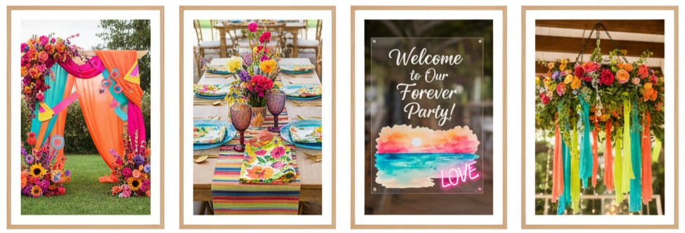 Décor is where your colorful summer wedding truly comes to life. Instead of sticking to standard arrangements, you can layer textures, patterns, and creative elements to highlight your palette. Think of décor as the expressive side of your wedding—a chance to show personality and create an immersive experience.