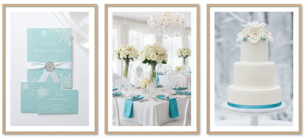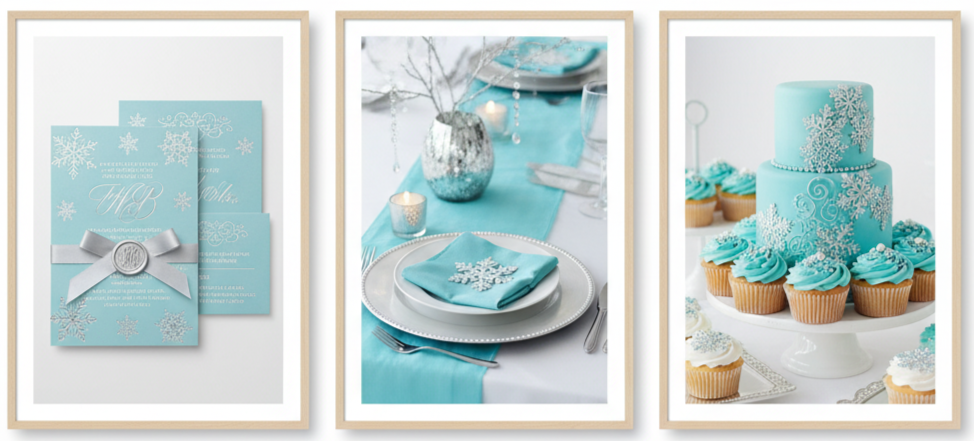 Key Takeaway: Tiffany Blue isn’t just a color—it’s a complete winter wedding mood. It blends beautifully with winter landscapes, elevates classic décor, and brings a sophisticated charm into every detail of your big day.