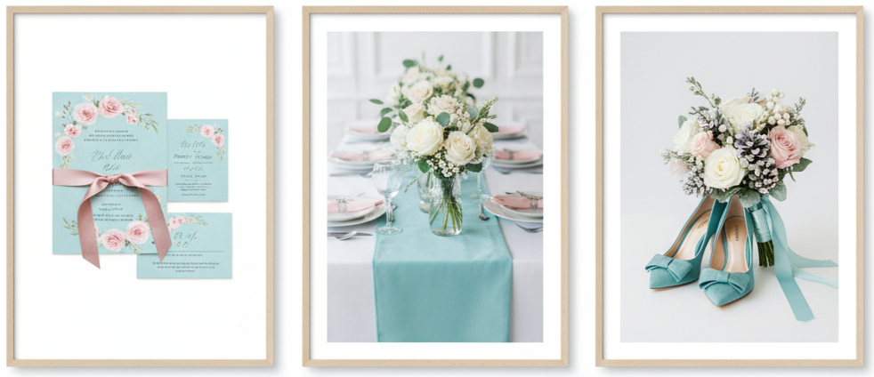| Tiffany Blue + Blush | Soft, romantic, airy | Bouquets, bridesmaid dresses, photo setup |