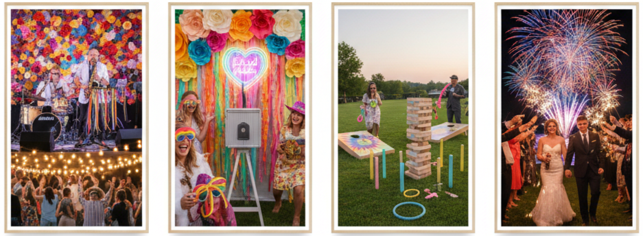 Encouraging guests to follow a colorful dress code like “vibrant cocktail attire” brings your theme to life even more.