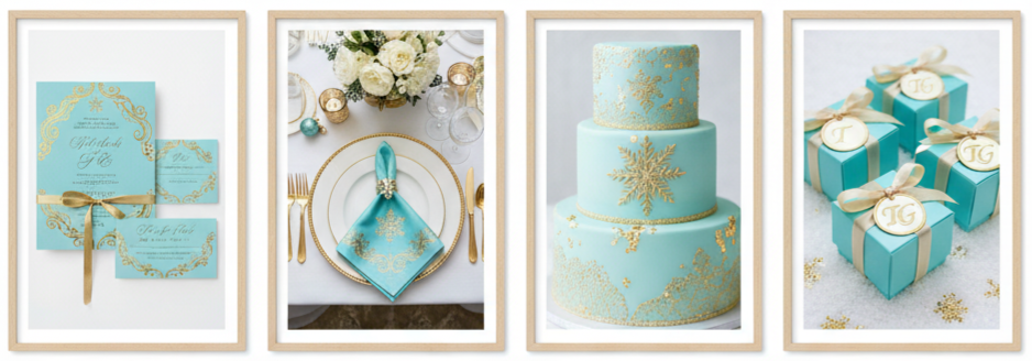| Tiffany Blue + Gold | Warm, rich, glamorous | Invitations, cake décor, place settings |