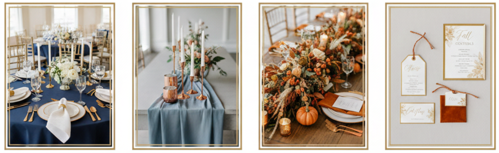 Reception décor is where the palette becomes the atmosphere. Table linens, napkins, centerpieces, candles, and chargers all play a role. Navy linens with gold accents felt formal and clean. Dusty blue runners with copper candle holders felt modern and soft. Burnt orange details against wood tables made everything feel warm and seasonal. Couples also used small touches like escort cards, favor tags, and bar signage to keep the palette present without needing more big elements.