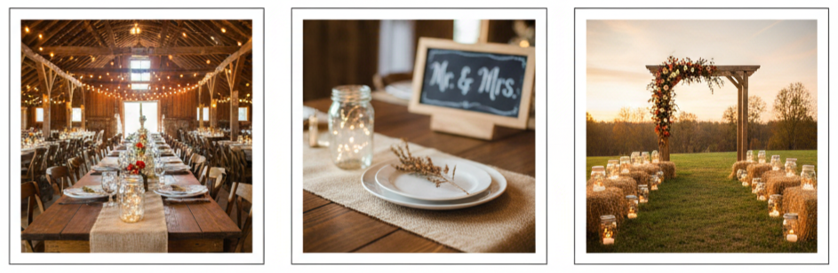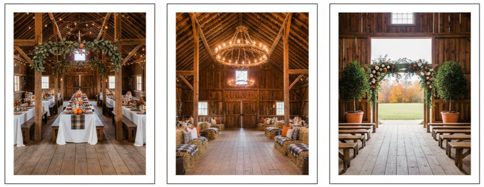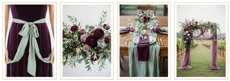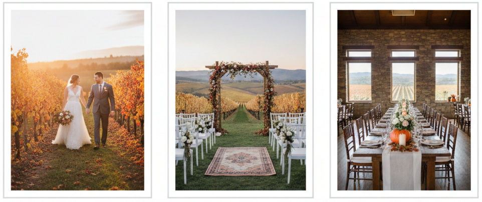 | Plum & Sage | Earthy contrast | Rustic, Vineyard | Barn, Winery |