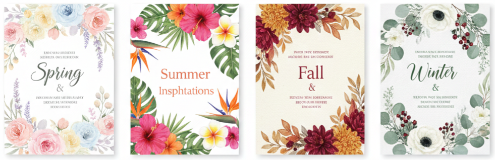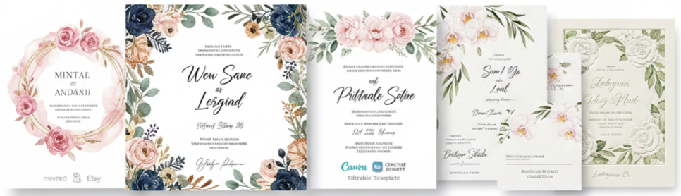 - Artwork Style: Watercolor florals, hand-drawn greenery, and simple botanical sketches create a relaxed yet polished look. The designs often leave plenty of white space to keep the layout clean.