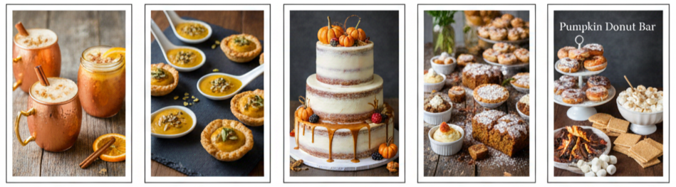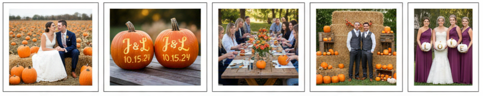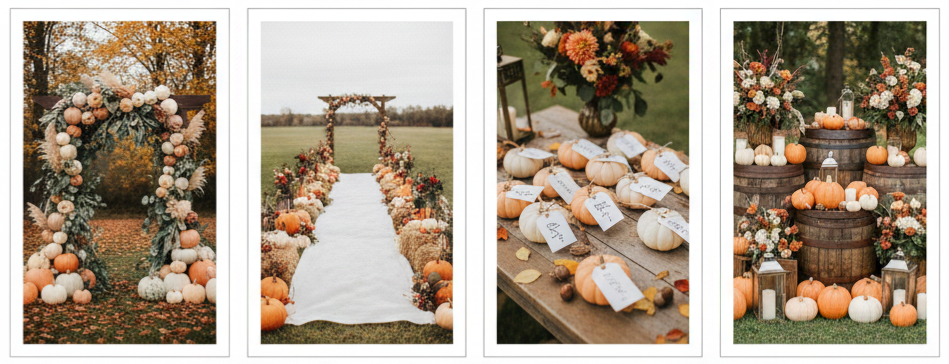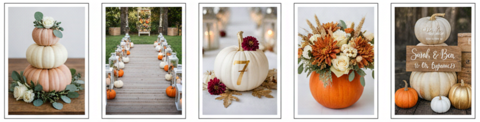 - Pumpkin Styling: White and heirloom pumpkins look clean and elevated for centerpieces, aisle markers, escort tables, and photo corners. Painted pumpkins in your palette can also look modern and cohesive.