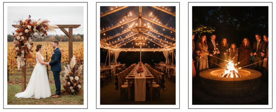 Comfort is mostly about warmth and planning. Offer blankets at the ceremony, use heaters or fire pits when allowed, and make warm drinks available during cocktail hour and later in the evening. Lighting also matters, since earlier sunsets can make outdoor spaces feel chilly unless they’re well lit.