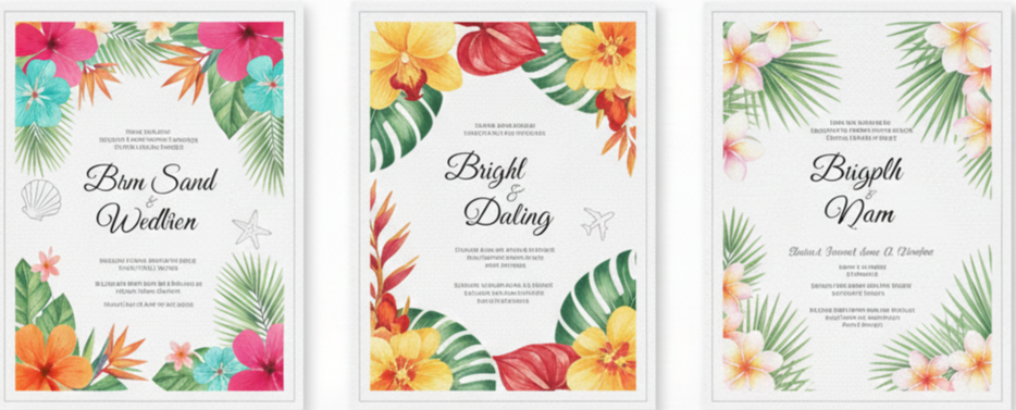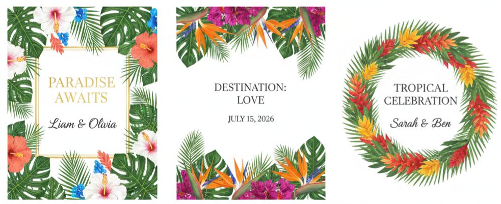 Bold leaves, hibiscus flowers, and vibrant colors instantly suggest warmth and celebration. Tropical designs are popular for beach weddings, destination ceremonies, or couples who want their invitations to feel energetic and joyful.