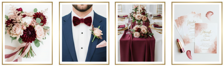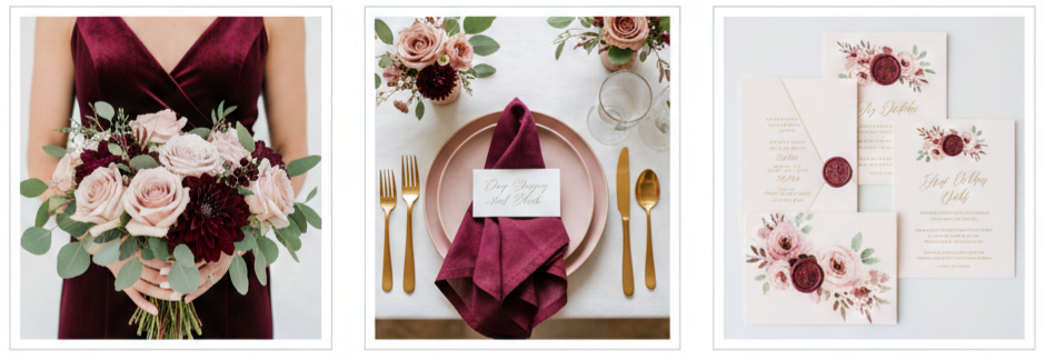 | Marsala & Blush | Romantic tones | Vintage, Elegant | Ballroom, Estate |