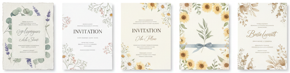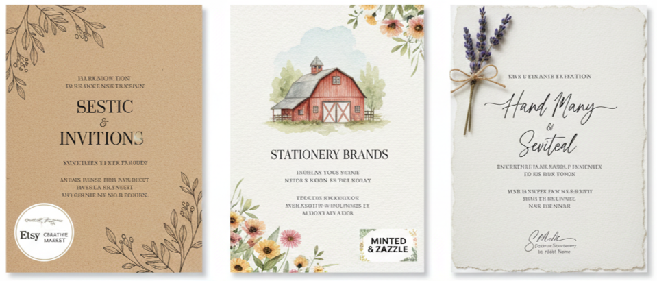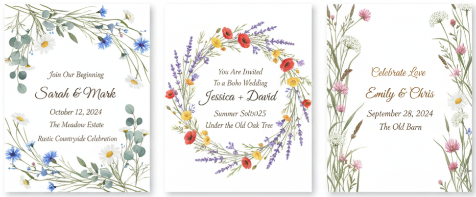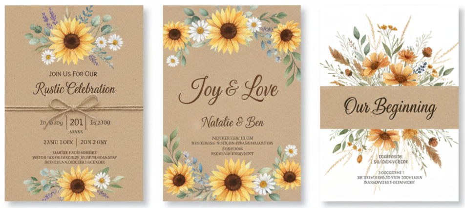 Wildflowers, sunflowers, and earthy tones feel right at home in rustic settings. Kraft paper, soft neutrals, and simple fonts help complete the look.