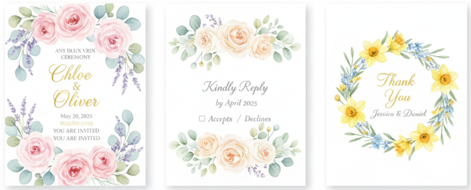 - Coordinating the Suite: Save-the-dates, RSVP cards, envelopes, and thank-you notes should match the floral theme for a cohesive look.