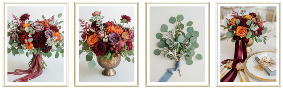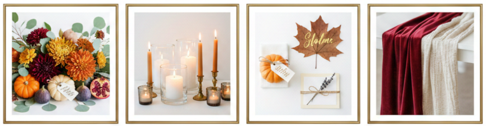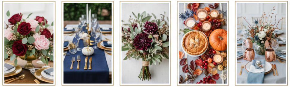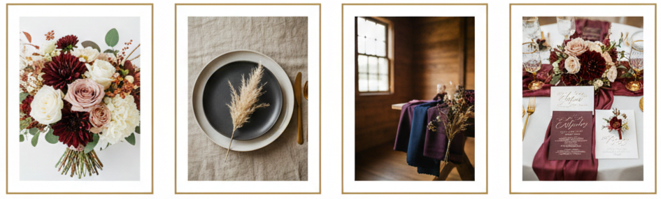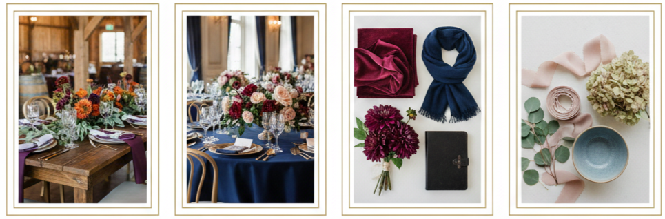 We also want the colors to feel like you. A simple way to narrow it down is to think about the shades you already love in clothing, home décor, or even your favorite flowers. If you gravitate toward deeper tones, marsala, navy, or plum might feel right. If you love softer moods, blush, sage, and dusty blue can bring calm balance to a richer fall setting.