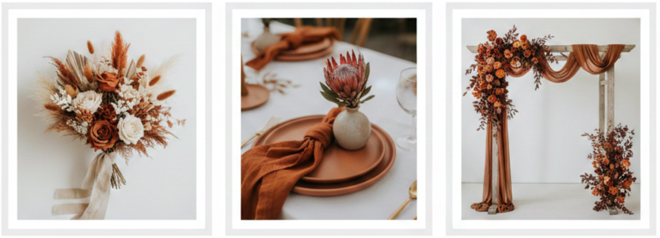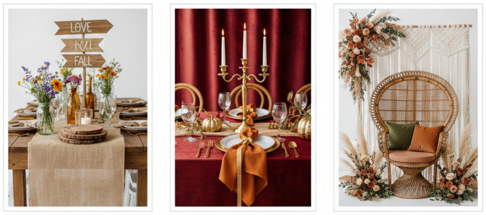 | Burnt Orange & Cranberry | Seasonal warmth | Cozy, Festive | Outdoor, Lodge |