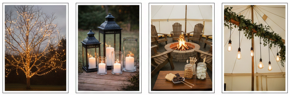 - String Lights: Draping warm white string lights across trees, tent frames, ceilings, or beams creates a soft glow that looks great in photos.