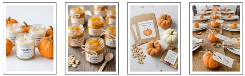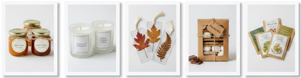 Fall favors feel most memorable when they’re useful or edible. Mini jars of apple butter, small bottles of maple syrup, or caramel popcorn work well because guests can enjoy them later. Cozy options like simple flannel scarves or personalized mugs also match the season and feel practical.