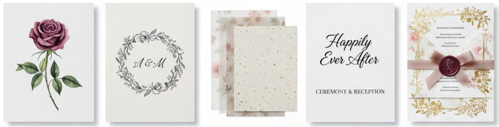 - Paper Selection: Paper type plays a bigger role than many couples realize. Cotton cardstock feels soft and luxurious, vellum adds elegance, and recycled paper works well for eco-conscious weddings.