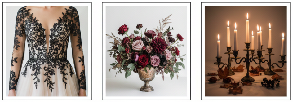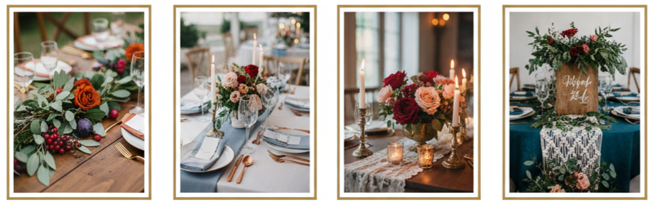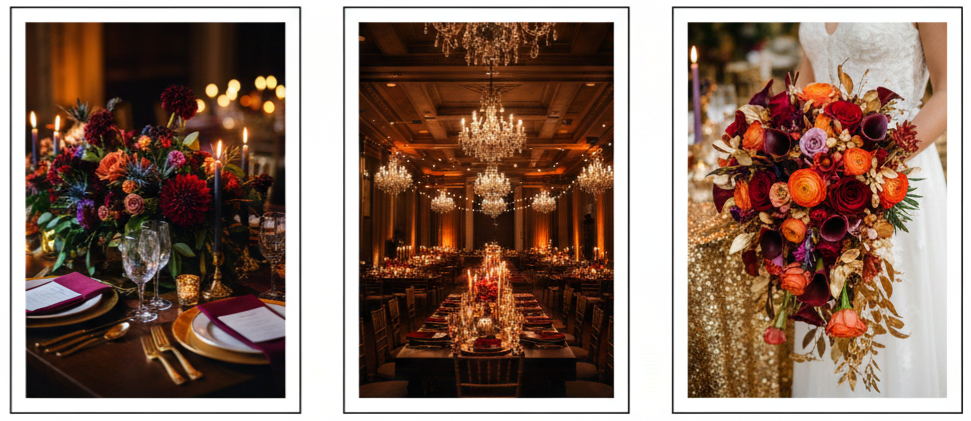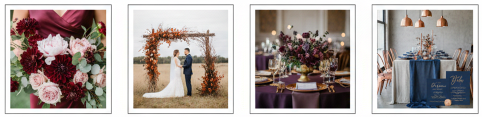 Rustic weddings leaned toward burnt orange, cranberry, sage, and plum because those tones matched wood textures, greenery, and outdoor settings. Modern weddings looked strong with dusty blue and copper or navy and gold, especially when paired with clean lines and minimal décor. Vintage romance leaned into marsala and blush with candlelight, lace textures, and softer florals. Boho styling paired jewel tones with layered greenery and textured details like macramé, wood signage, and free-form arrangements.