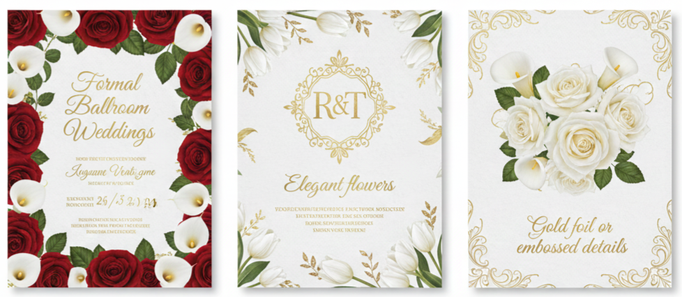 Elegant flowers such as roses, tulips, or calla lilies combined with gold foil or embossed details create a refined look that matches upscale venues.