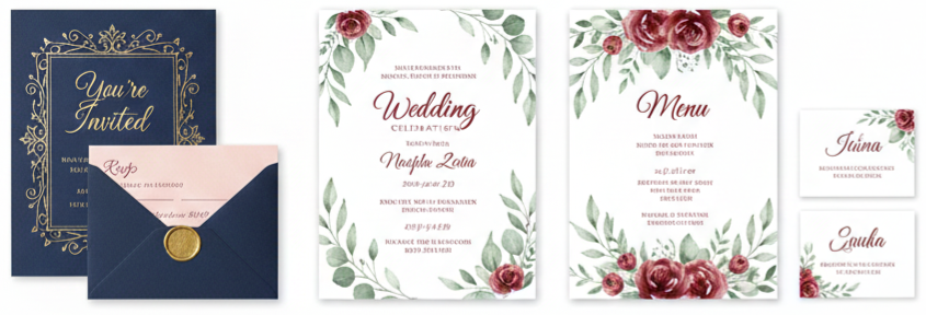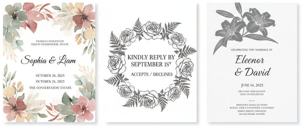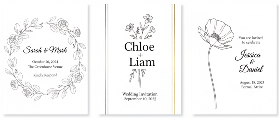 - Custom Illustrations: Hand-drawn floral crests, monograms, or borders give invitations a one-of-a-kind feel and reflect your personality as a couple.