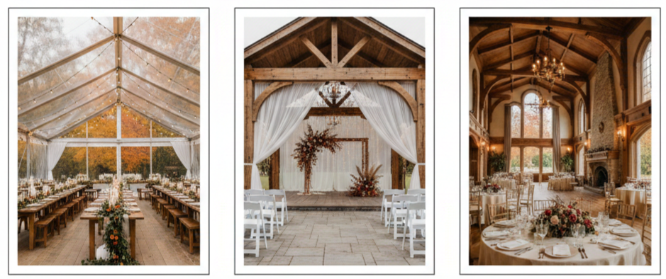 - Work With the Venue: Barn beams, stone fireplaces, vineyards, and gardens already bring character, so decor should highlight those features instead of covering them up.