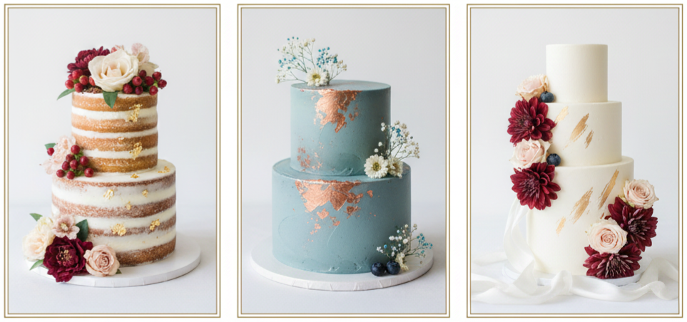 Fall cake styling looks great with natural textures and seasonal accents. Fresh or dried flowers, figs, cinnamon sticks, and subtle greenery can match your florals without overcomplicating the look. A semi-naked or textured buttercream finish also pairs well with autumn themes.