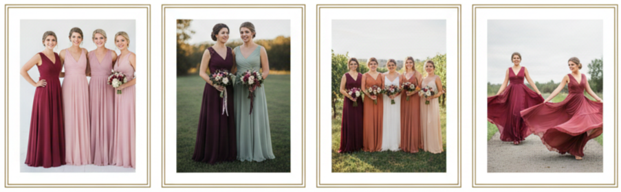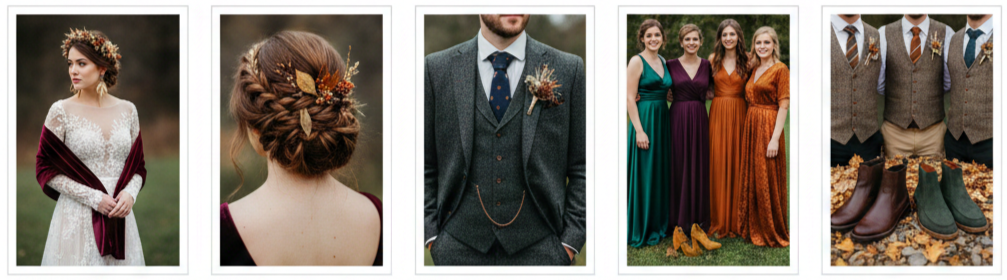 We can bring the palette into accessories and beauty details. Shoes, hair pieces, bouquet ribbon, and jewelry can reflect the wedding colors in subtle ways. Makeup is another option, like a marsala lip or copper-toned eyeshadow. These touches connect the bridal look to the palette while keeping the overall style classic.