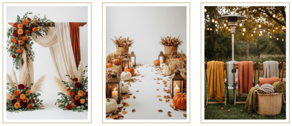 Fall wedding decorations feel special when we lean into the season’s natural warmth and keep the design consistent from start to finish. A strong palette, textured florals, cozy lighting, and a few personal seasonal touches can make the day feel inviting without feeling overly themed. When the ceremony and reception share the same style cues, the entire celebration looks polished, photographs beautifully, and feels easy for guests to enjoy.