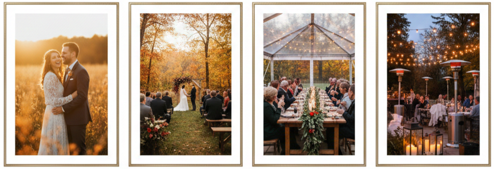 Lighting can turn a basic venue into something magical, especially in fall when the sun drops earlier. Warm lighting makes everything look softer, brings out autumn colors, and keeps the reception feeling cozy all night.