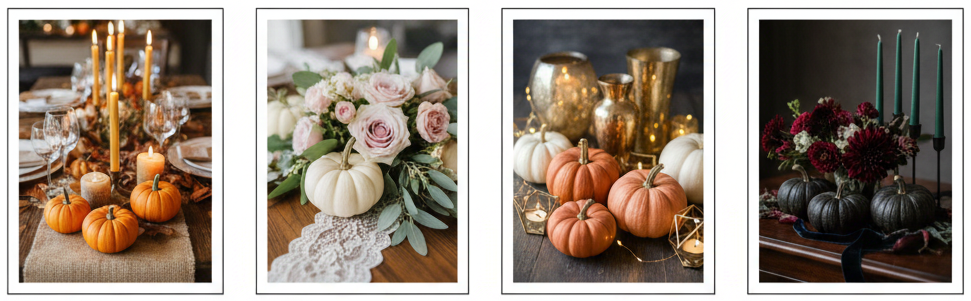 - Painted Pumpkins: Metallic spray paint or matte chalk paint can match your palette and create modern table decor. Stencils make it easy to add initials or table numbers.