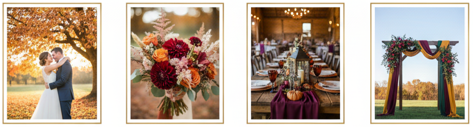 Venues also play nicely with the season. Barns, vineyards, mountain lodges, estates, and indoor ballrooms all look better with deeper tones, soft neutrals, and a few metallic accents. We also get the practical perks of fall, like cooler temperatures and more comfortable outdoor ceremonies. When we combine those details with the right color palette, the entire wedding feels pulled together from the first invite to the final dance.