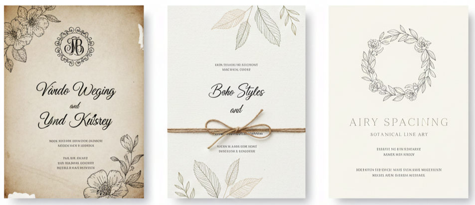 Botanical invitations suit couples seeking a rustic yet airy, refined look. They’re perfect for spring and summer weddings, and dried floral designs also fit fall celebrations.