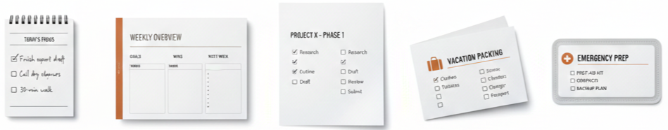 - Packing checklists: Whether it’s a vacation or a business trip, a list helps you avoid the last-minute scramble.