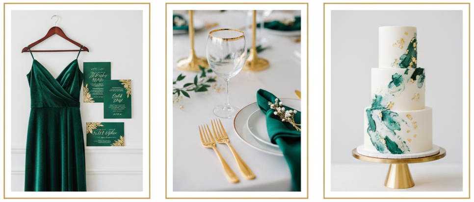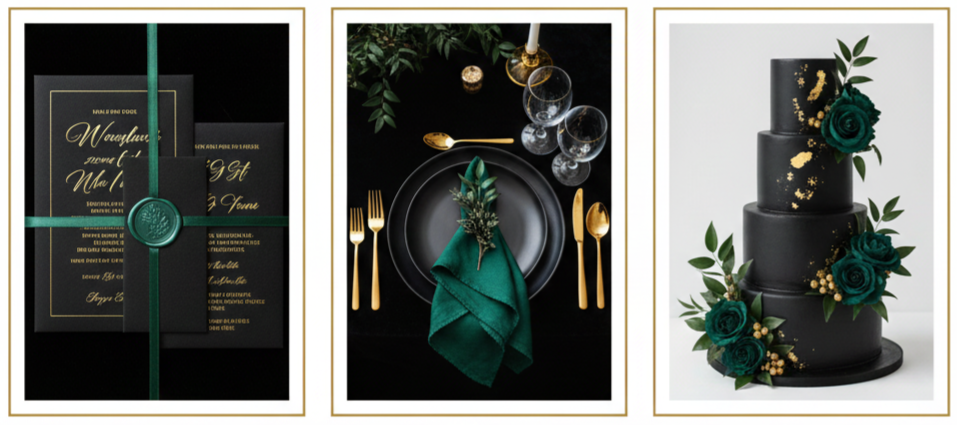 Black sets a bold foundation, gold adds elegance through metallic accents, and emerald brings richness through florals or attire. This palette suits formal evening weddings and upscale venues.