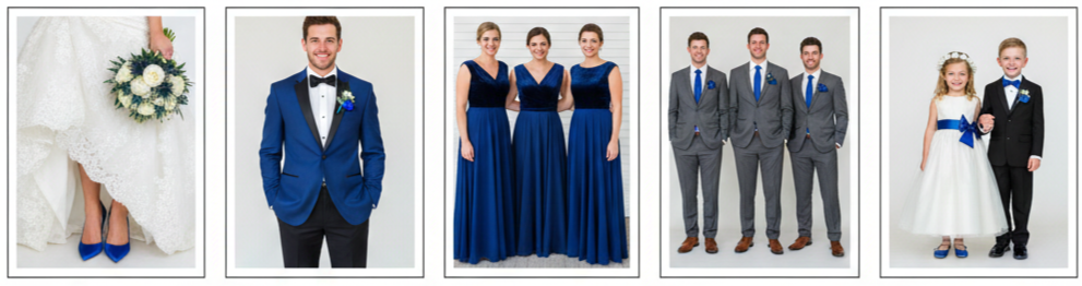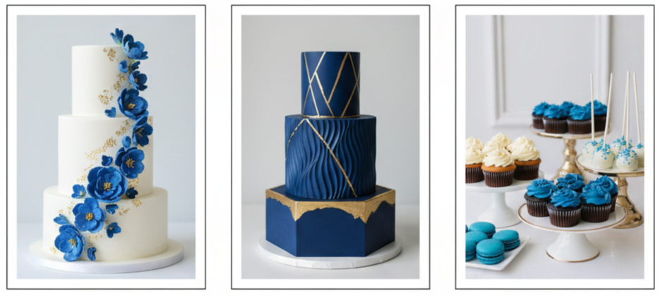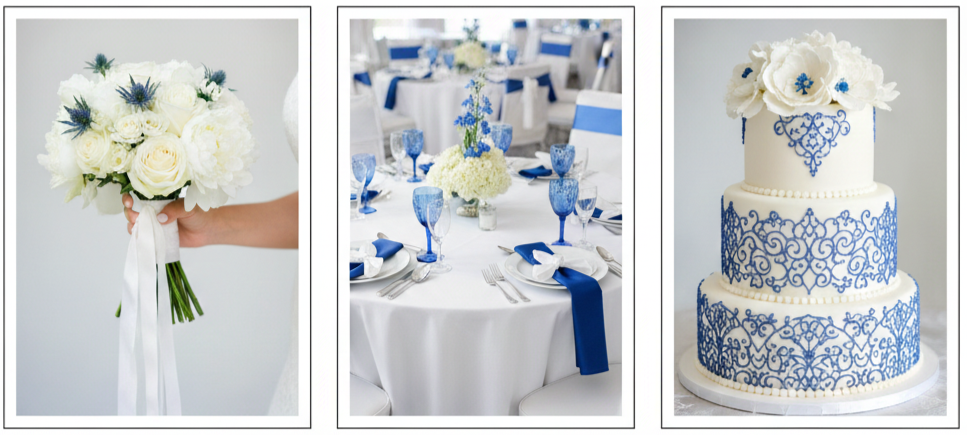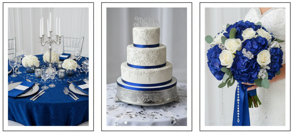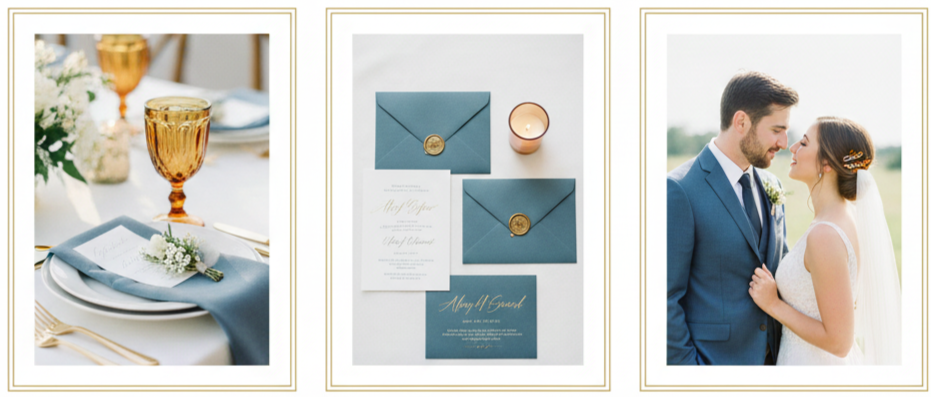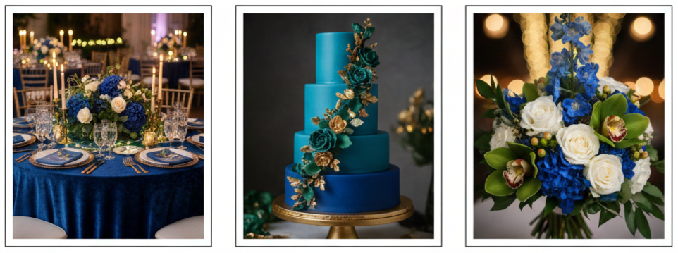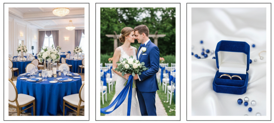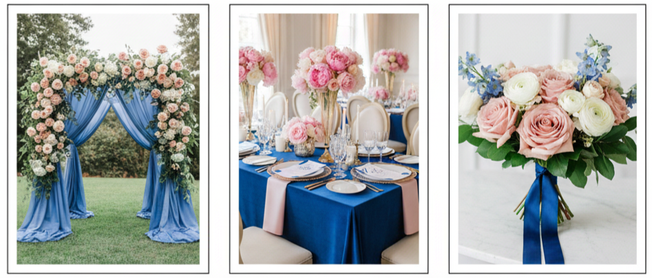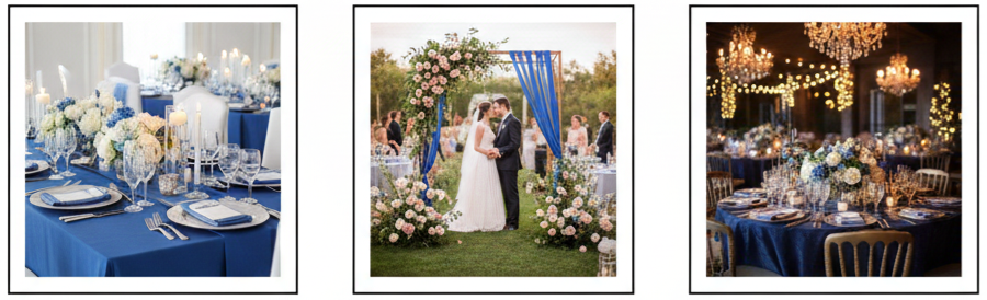 - Bold contrasts: Navy or charcoal grounds the blue and works well for evening or fall weddings.