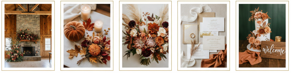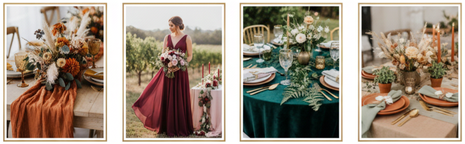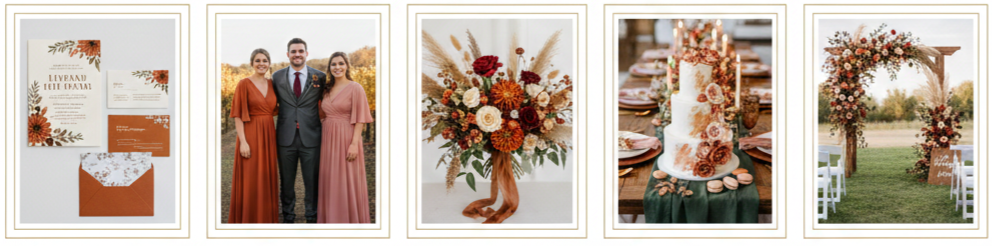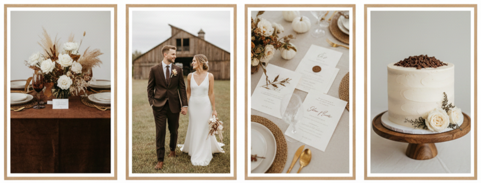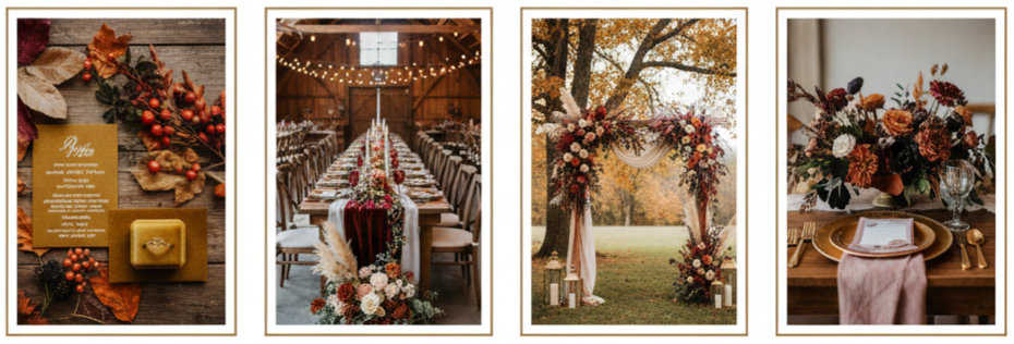 Some color combinations continue to dominate fall weddings because they are reliable, elegant, and easy to style. These classic pairings work across décor, attire, florals, and stationery without feeling dated.