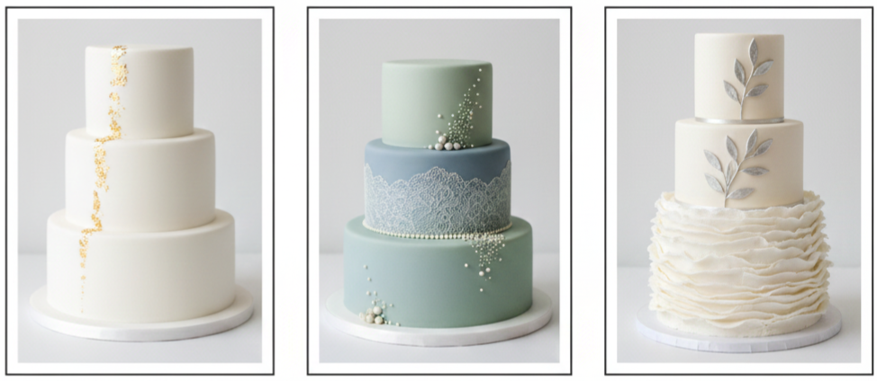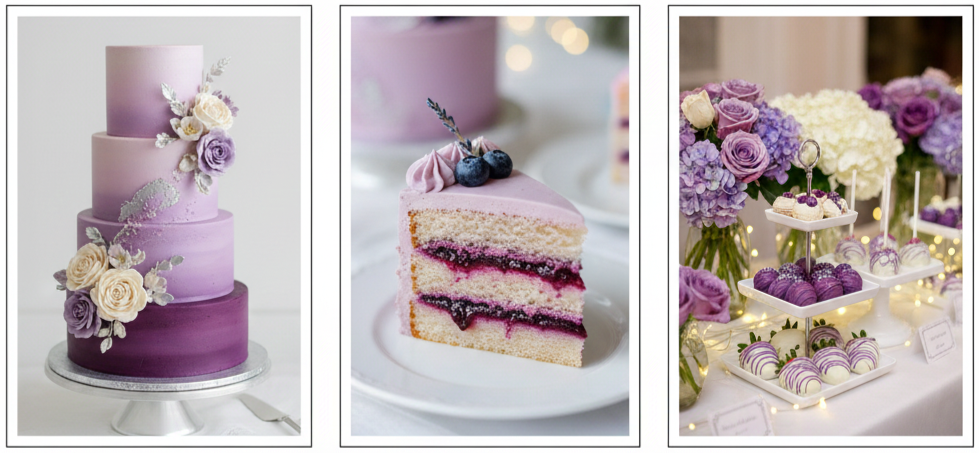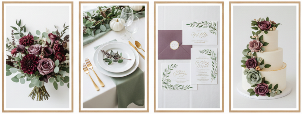 Plum introduces drama and elegance, while sage green balances it with softness. This color scheme is especially effective in floral-heavy designs where greenery plays a central role.
