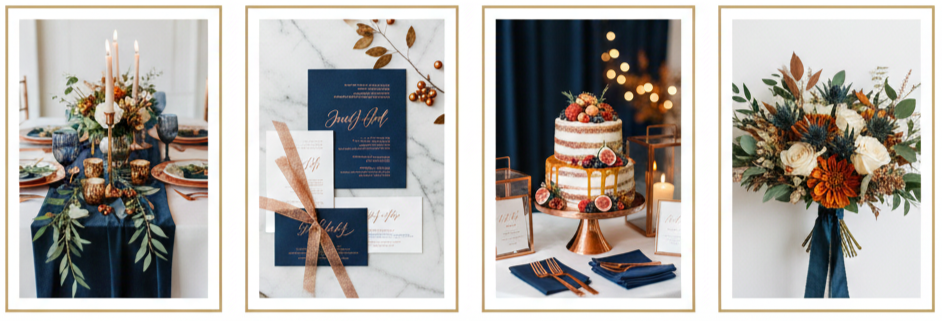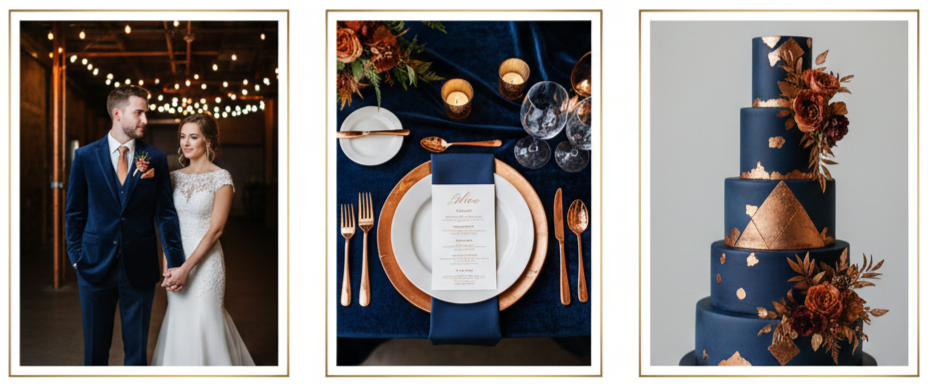 Navy provides a strong, polished base that feels formal without being stiff. Copper adds warmth and shine through accents like candle holders, chargers, signage, or flatware, making this combination ideal for evening receptions.