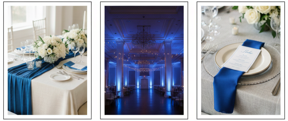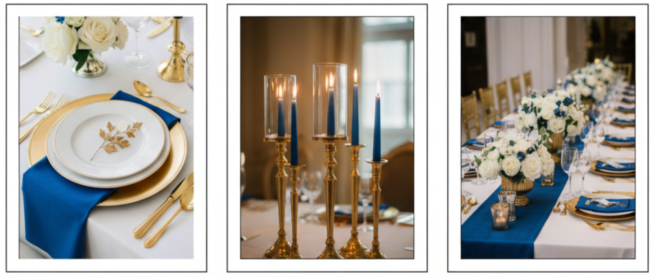 Amber introduces warmth through lighting or glassware, while slate blue adds a cool contrast in linens, suits, or invitations. This combination feels unexpected yet balanced.