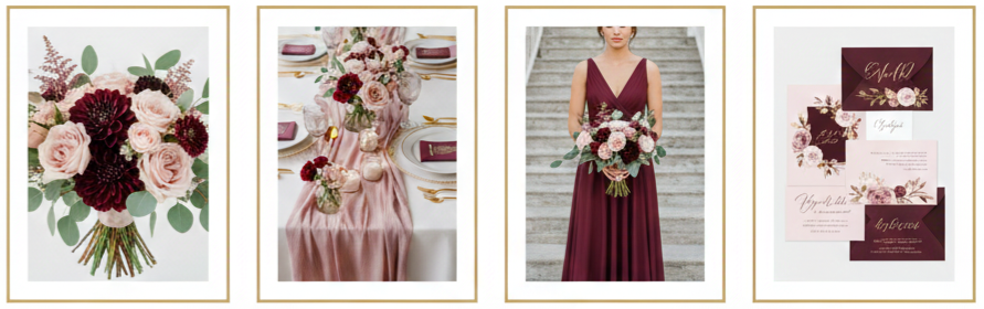 Burgundy brings richness and depth, while blush softens the overall look. This pairing works beautifully for romantic weddings, especially when burgundy appears in dresses or florals and blush shows up in table linens, stationery, or bouquets.