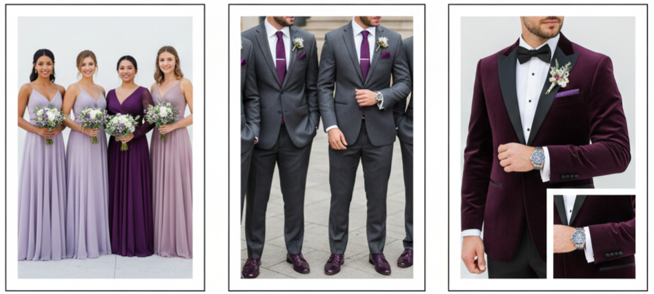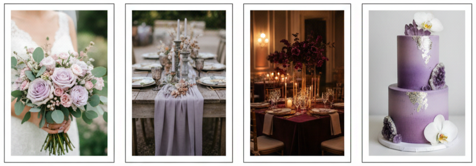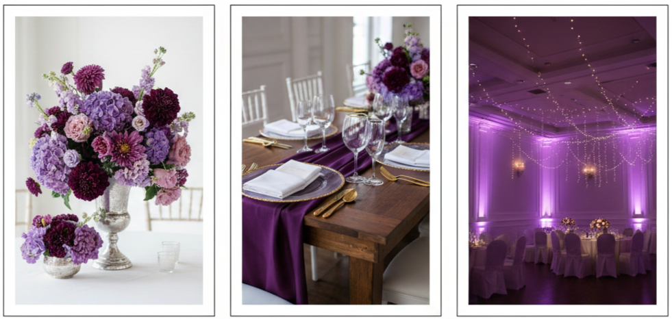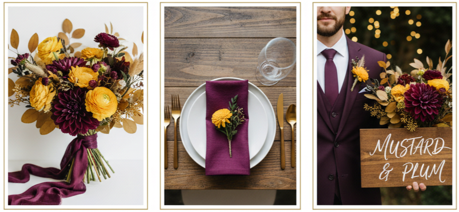 Use plum as your anchor with napkins, suits, or signage, then sprinkle mustard in the florals or table accents. These colors look fantastic against natural wood, greenery, or neutral backdrops. Add some soft lighting, and the result is creative, cozy, and full of personality.