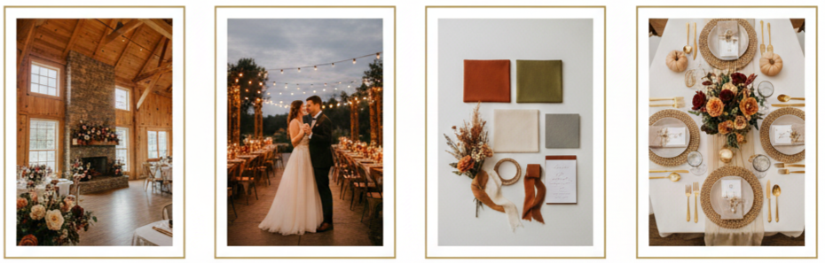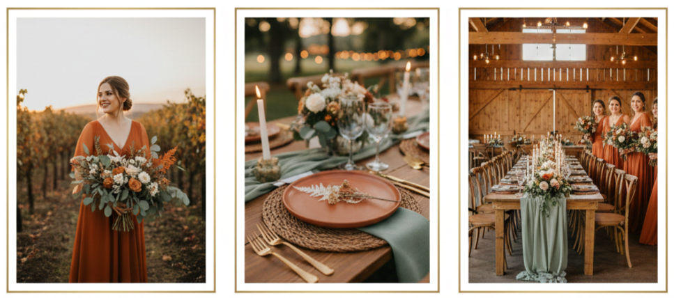 A successful fall wedding color scheme shows up consistently across the entire day, from the first impression to the final farewell. Each element should feel connected without appearing overly matched.