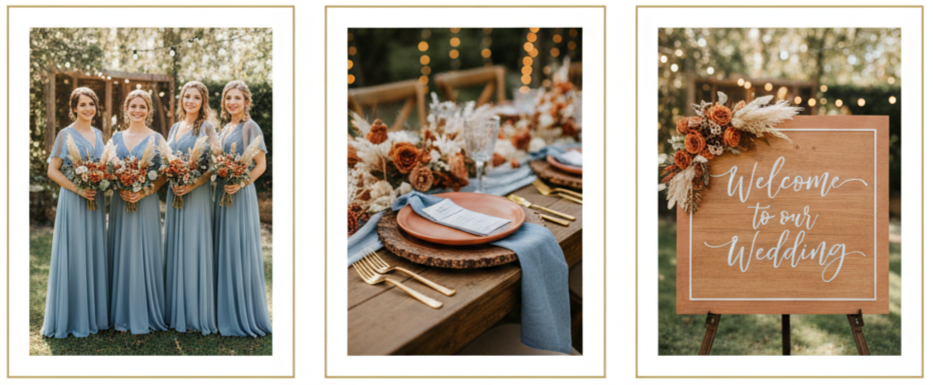 Dusty blue bridesmaid dresses look fresh and elegant, while terracotta florals, napkins, or signage bring in that seasonal warmth. Add pampas grass, rustic wood, and string lights, and you’ve got a well-balanced design that feels just right for fall without being overly traditional.
