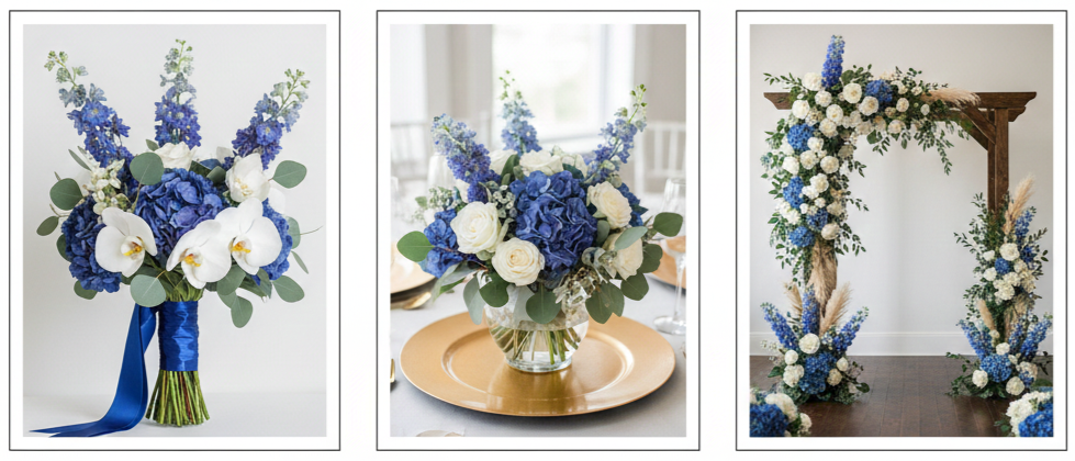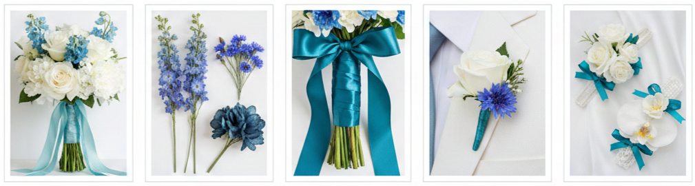 - Floral types: Delphiniums, cornflowers, or silk florals work well to capture the color.