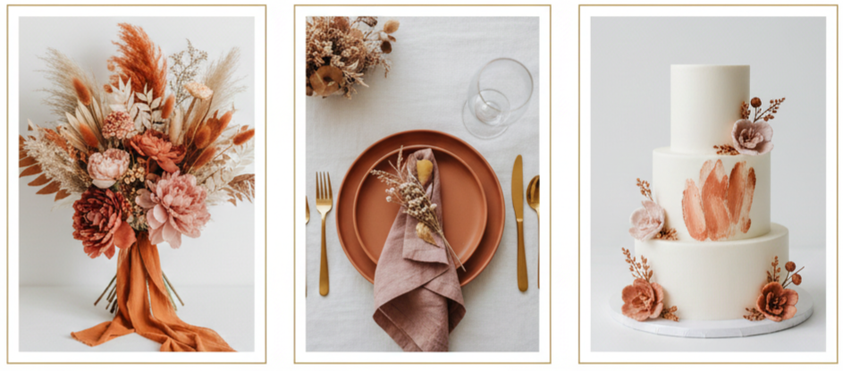 Terracotta adds warmth and structure, while dusty rose softens the look. This palette works well in boho, desert, or minimalist-inspired weddings where natural textures take center stage.