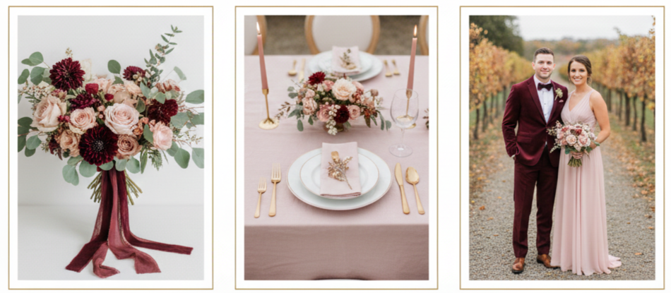 Picture velvet burgundy suits or bridesmaid gowns, bouquets with roses in both hues, and candles casting a soft glow. Blush linens and touches of gold create a balance that feels both regal and approachable. Whether you’re hosting an afternoon ceremony or an evening affair, this color story fits right in.