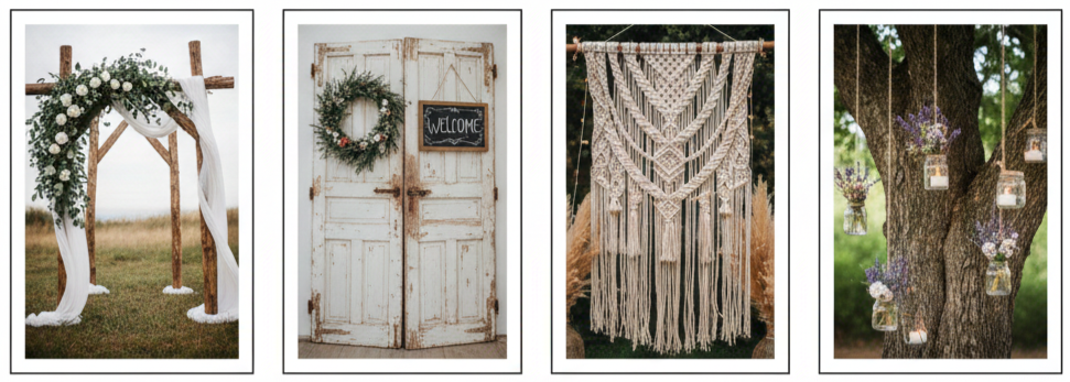 - Wedding Arch: A handmade arch built from wood, copper piping, or PVC creates a strong focal point. Draping fabric, faux florals, or greenery transforms the structure into something elegant and photo-ready.