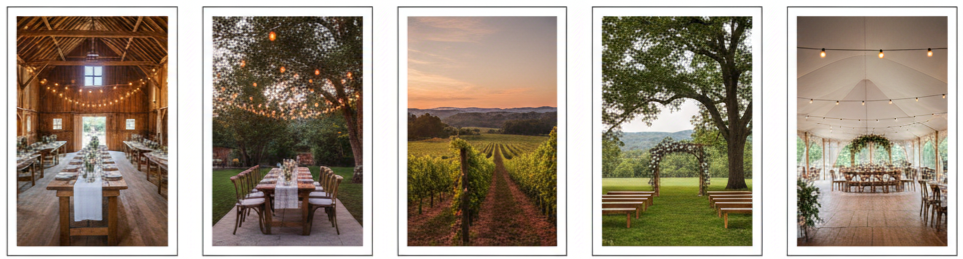 These spaces offer rustic charm with exposed beams, wood textures, and plenty of character. Many barns are renovated to include lighting, flooring, and climate control, making them practical and beautiful.