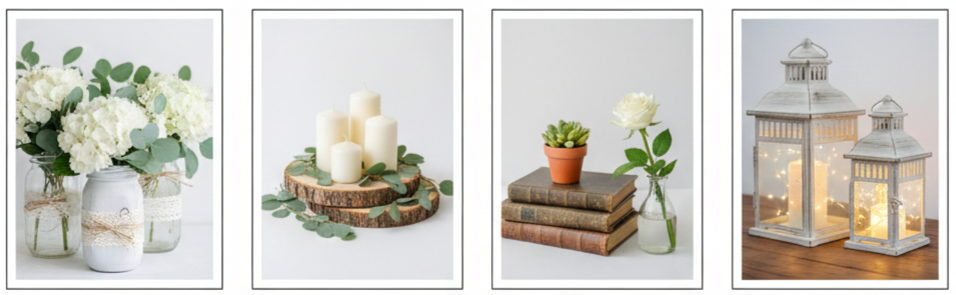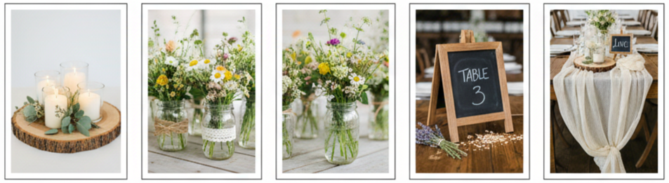 - Mason Jar Florals: Painted or clear jars filled with flowers work for nearly any theme. Adding lace, twine, or tags keeps them visually interesting without extra expense.