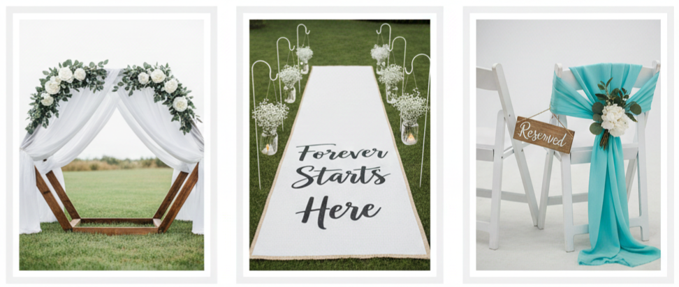 - Chair Decor: Reserved seating signs, fabric sashes, or small floral bundles placed on chairs add detail without cluttering the ceremony layout.