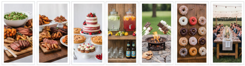 - Drink Stations: Lemonade bars, sweet tea, signature cocktails in mason jars, and local craft beer add personality.