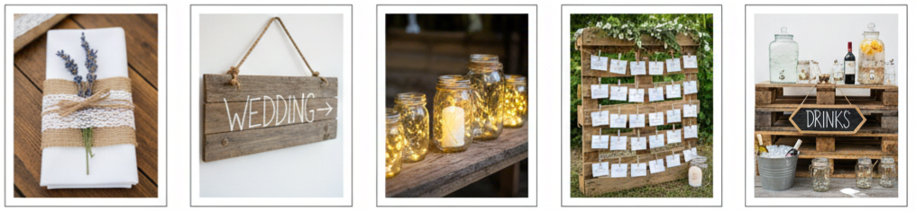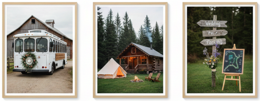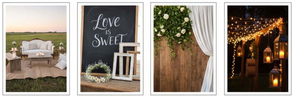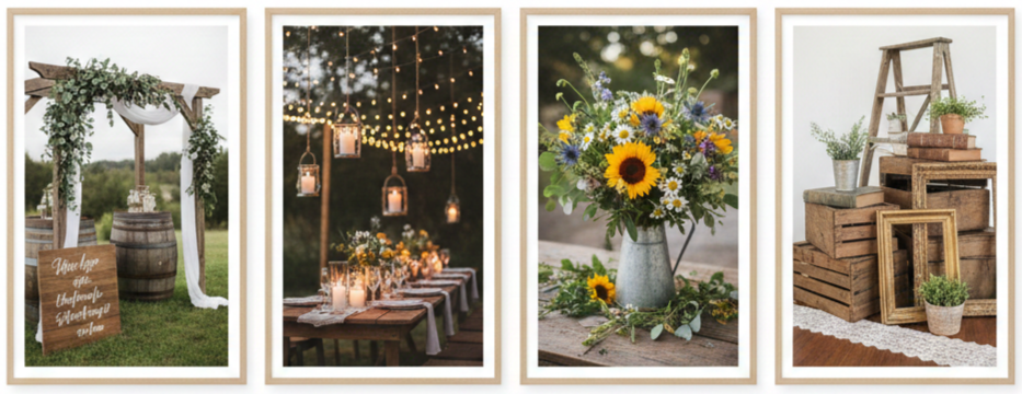 - Wood Accents: Handcrafted signs, ceremony arches, farm tables, and barrels add structure and rustic appeal.